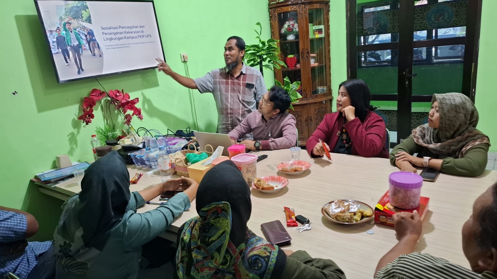Materi sosialisasi disampaikan oleh Wakil Dekan III FKIP, Dr. Munadi, yang menjelaskan peran penting Satuan Tugas (Satgas) dalam memberikan layanan perlindungan, penanganan laporan, serta edukasi pencegahan. Dalam pemaparannya, beliau menekankan bahwa seluruh unsur fakultas, termasuk tenaga kependidikan, memiliki peran strategis dalam mendukung terwujudnya lingkungan belajar yang aman dan berkeadilan.