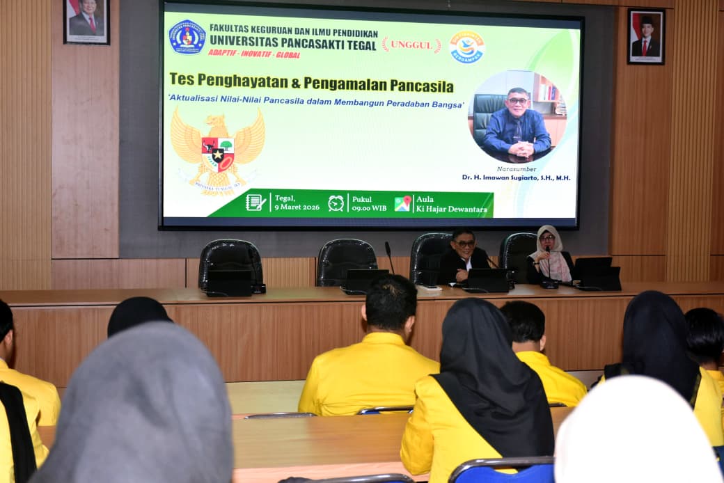 Fakultas Keguruan dan Ilmu Pendidikan (FKIP) Universitas Pancasakti Tegal menyelenggarakan kegiatan Tes Penghayatan dan Pengamalan Pancasila (TP3) pada Senin, 9 Maret 2026. Acara yang berlangsung secara luring di Gedung Aula Ki Hajar Dewantara Kampus 1 UPS ini diikuti oleh 43 peserta calon wisudawan.