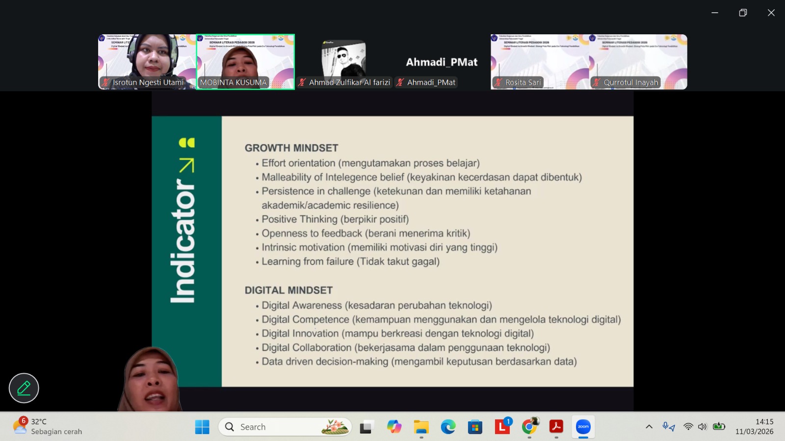 Memasuki sesi inti, narasumber memaparkan berbagai perspektif mengenai pentingnya keseimbangan antara kemampuan memanfaatkan teknologi (digital mindset) dengan sikap terus berkembang dan terbuka terhadap perubahan (growth mindset). Menurutnya, guru dan calon pendidik tidak hanya dituntut mampu menguasai teknologi, tetapi juga memiliki pola pikir yang adaptif, reflektif, dan inovatif dalam menghadapi dinamika pendidikan modern.