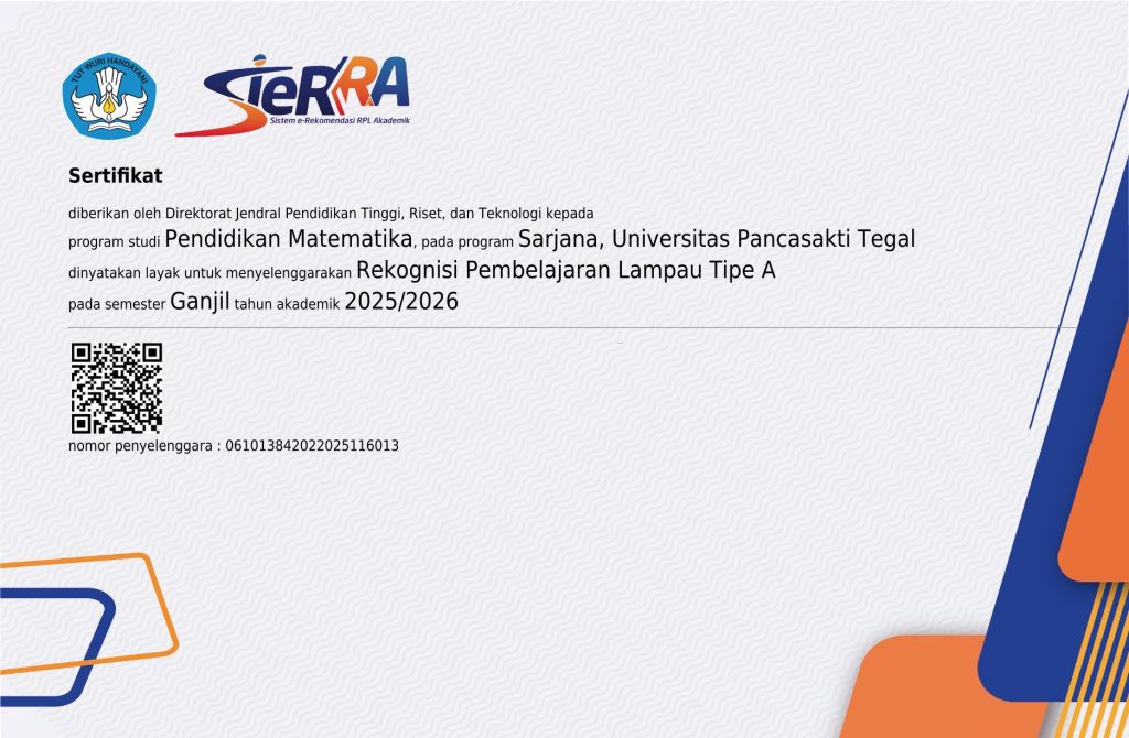 Program Studi Pendidikan Matematika merupakan salah satu prodi yang cukup lama di lingkungan Fakultas Keguruan dan Ilmu Pendidikan (FKIP) UPS Tegal. Keberadaan Prodi Matematika tidak terlepas dari keinginan untuk menciptakan guru-guru Matematika yang mempunyai wawasan keilmuan matematika serta terampil dalam membelajarkan Matematika. Berdasarkan SK Menteri Pendidikan dan Kebudayaan Republik Indonesia No. 0311/0/1982 tanggal 20 Oktober 1982, Prodi Pendidikan Matematika FKIP UPS tegal memperoleh Status Terdaftar. Kemudian pada tanggal 29 Agustus 1984 keluarlah izin penyelenggaraan Prodi Pendidikan Matematika didasarkan Surat Keputusan (SK) Mendikbud Nomor 0395/0/1984. Selanjutnya pada tanggal 9 April 1992 Prodi PMTK memperoleh status Diakui berdasarkan Surat Keputusan dari DIKTI Depdikbud Nomor 104/DIKTI/Kep/1992. Perkembangan saat ini program studi Pendidikan Matematika telah mendapatkan Sertifikasi Akreditasi BAN-PT No. 2413/SK/BAN-PT/Ak-PPj/S/IV/2020 dengan peringkat B.
