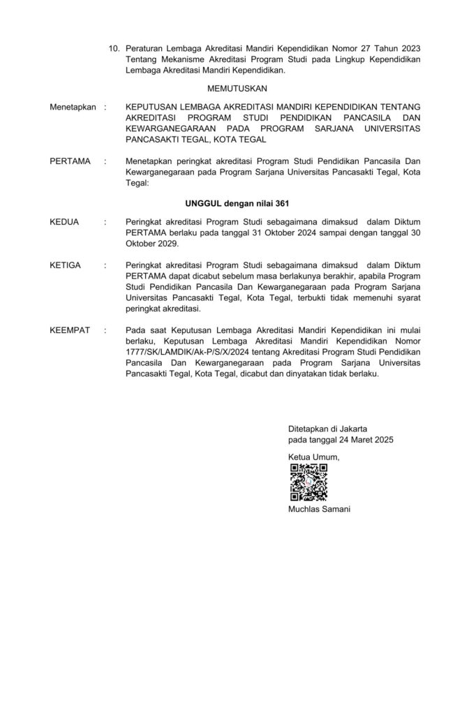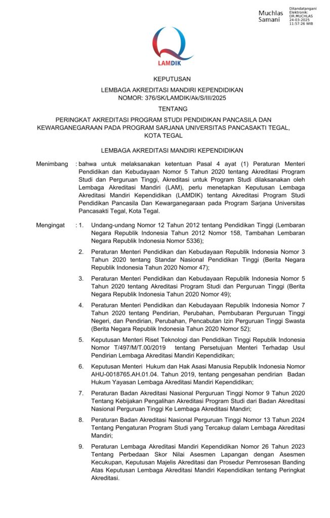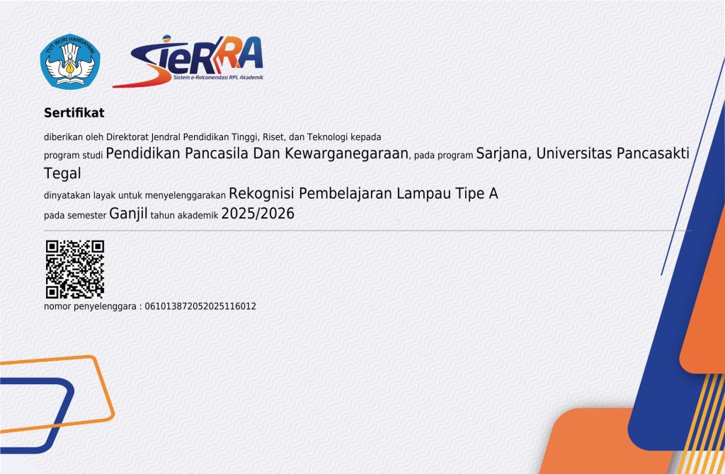 Program Studi Pendidikan Pancasila dan Kewarganegaraan adalah Progrtamn Studi yang secara formal mulai berdiri sejak tahun 1982 didasarkan pada SK Mendikbud No. 0311/O/1982 dan telah terakreditasi Baik Sekali melalui keputusan BAN-PT No. 4314/SK/BAN-PT/Ak.KP/S/X/2023