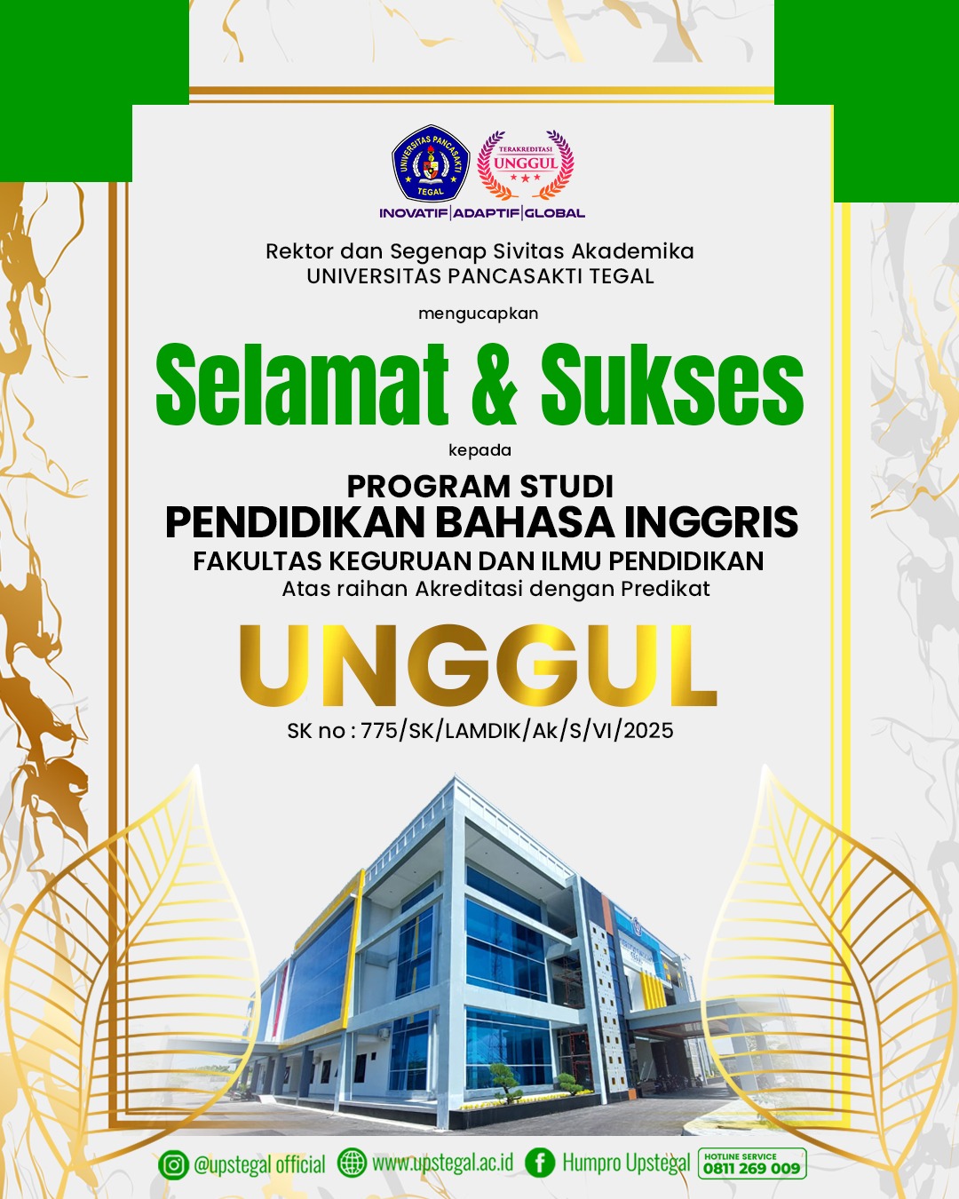 Program Studi Pendidikan Bahasa Inggris (PBI) Fakultas Keguruan dan Ilmu Pendidikan (FKIP) Universitas Pancasakti (UPS) Tegal berhasil meraih akreditasi Unggul dari Lembaga Akreditasi Mandiri Kependidikan (LAMDIK). Pengakuan ini tertuang dalam Surat Keputusan LAMDIK Nomor: 775/SK/LAMDIK/Ak/S/VI/2025.